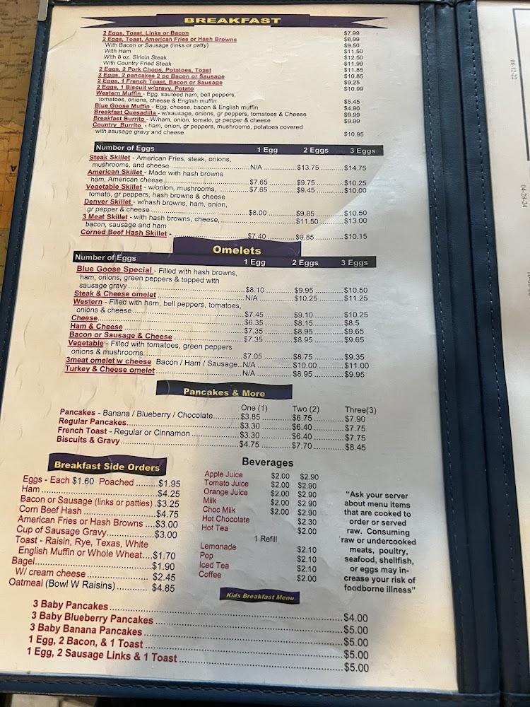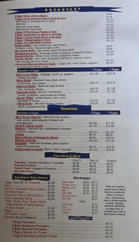 The menu at Blue Goose Cafe offers a delectable array of dishes. Breakfast options range from classic pancakes to nutritious omelets. Diners delight in customizable plates, ensuring satisfaction with every order.