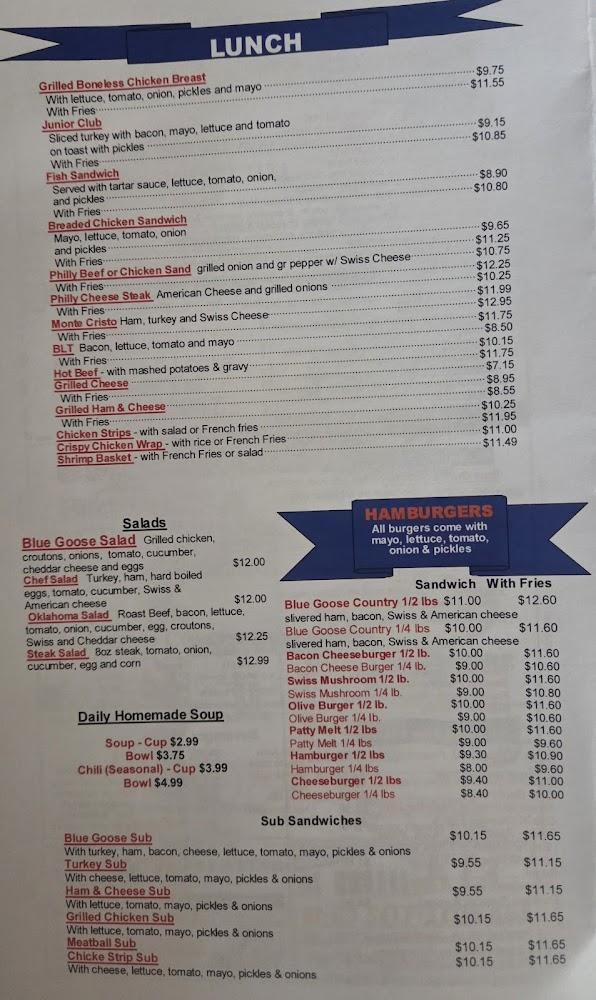 Lunch and dinner features include hearty sandwiches, burgers, and homestyle dinners. The 1/2 lb Blue Goose burger receives much praise. Dinner salads and specialty entrees provide something for every palate.